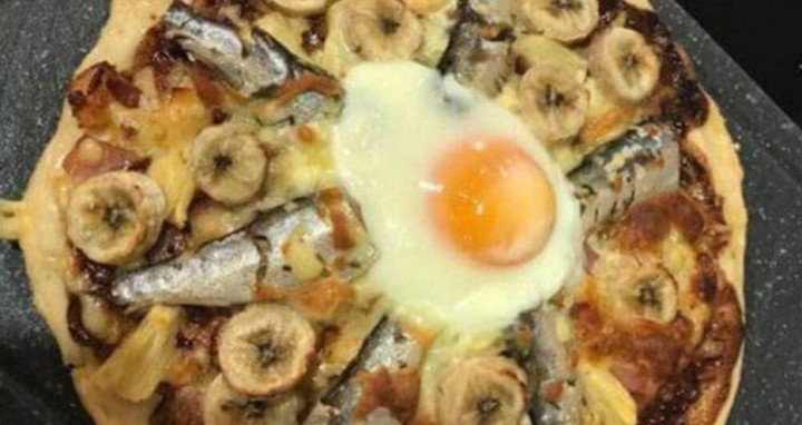 Дальше обжариваем лук до золотистого цвета и выкладываем на лепешку. Дальше яблоки, бананы, шпроты в масле и аккуратно разбиваем яйцо.