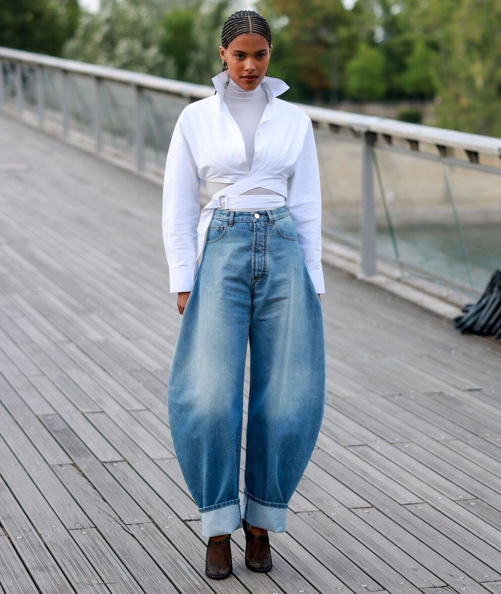 Самый частый грех - надеть объемные джинсы-бочки с таким же объемным верхом: пуховиком-дутиком, оверсайз-свитером, мешковатой рубашкой. Получается тот самый знаменитый силуэт «перевернутый треугольник», но в извращенной форме: тяжелый низ и тяжелый верх, соединенные невидимой талией.