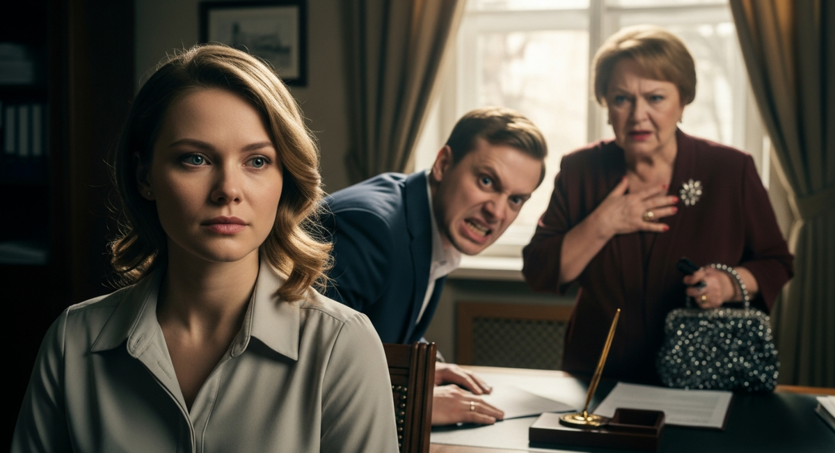 — Прошу вас покинуть помещение, — произнёс нотариус, нажимая кнопку вызова охраны. — Немедленно. Ирина Алексеевна остаётся для оформления необходимых документов.