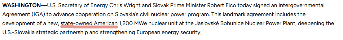 Министр энергетики США и премьер-министр Словакии подписали межправительственное соглашение "о развитии сотрудничества в рамках гражданской ядерной энергетической программы Словакии". В его рамках предусматривается строительство нового "государственного американского энергоблока" мощностью 1200 МВт на АЭС "Богунице". Полгода назад Роберт Фицо заявлял, что "У Westinghouse есть продукт — ядерный реактор мощностью 1250 МВт". Куда делся этот продукт и почему теперь говорится про явно другой реактор — неизвестно. Но и ладно. Не о том речь. 1. Данное соглашение не является обязующим документом. Контракт, если и будет подписан, то не ранее следующего года. А ввести в эксплуатацию (по открытой на данный момент информации) новый энергоблок планируется к 2040 году. Я бы исходил из того, что контракт подпишут. Интересно другое. 2. Почему в сообщении минэнерго США энергоблок называют "state-owned American 1,200 MWe nuclear unit", то есть "государственным американским энергоблоком". Возможно, я упу