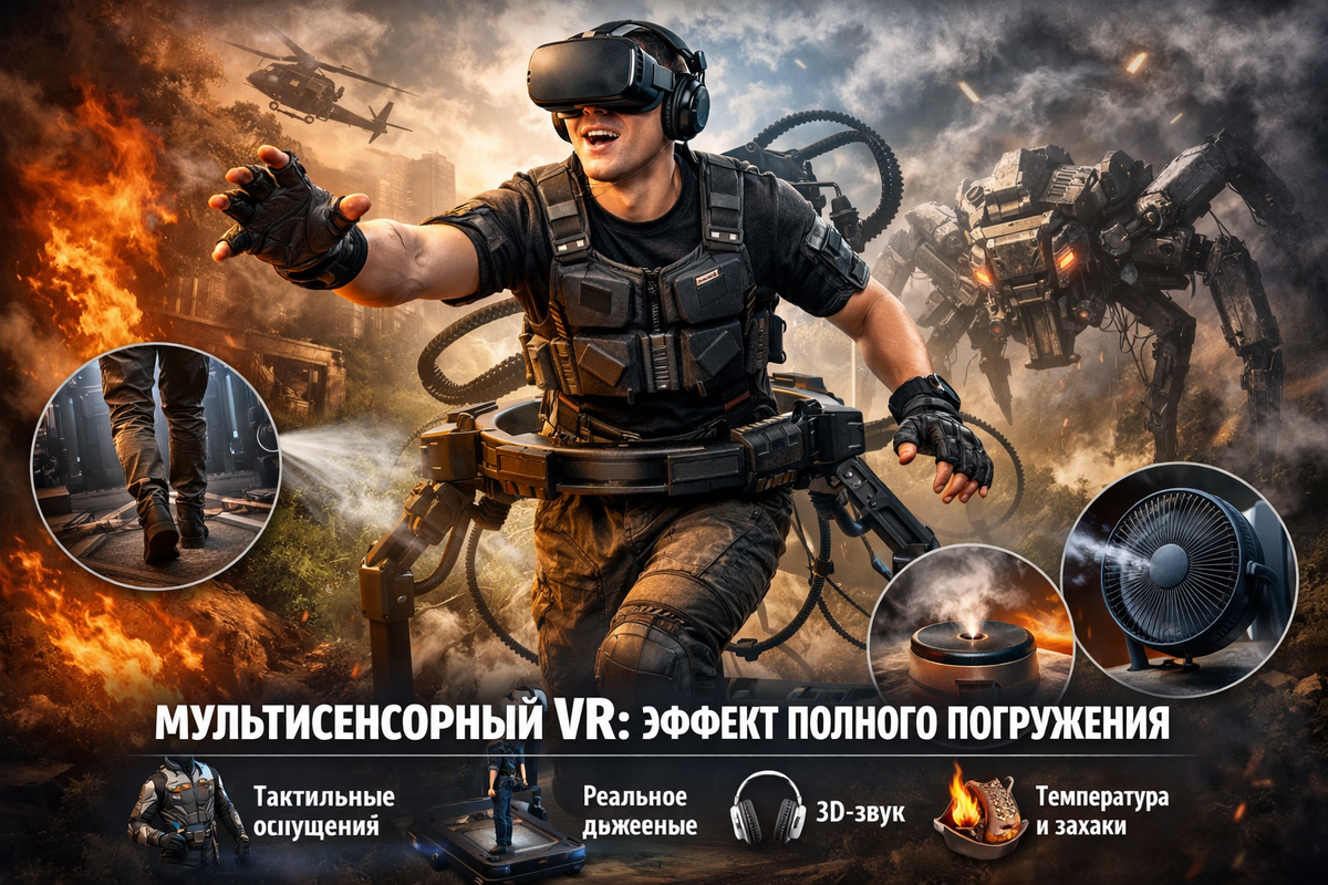 Если раньше виртуальная реальность ограничивалась картинкой и звуком, то в 2026 году VR делает следующий шаг — включает все органы чувств. Мультисенсорные VR-аттракционы перестают быть экзотикой и становятся новым стандартом в развлечениях, маркетинге и обучении. Но за счёт чего возникает то самое ощущение «я там»? Даже самая качественная картинка не обманывает мозг полностью.