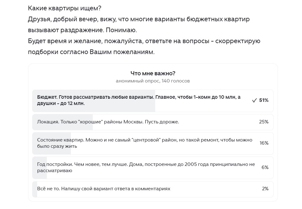 Друзья, благодарю Вас за участие в голосовании, итоги получились следующими: Больше половины читателей всё-таки за бюджет, в чём я с ними полностью солидарен. Поэтому, пожалуйста, не обижайтесь статьям с не очень вдохновляющими с точки зрения эстетики, но интересным в плане бюджета. Четверть наших читателей заинтересована в покупке только в "хороших" районах и на этом я бы с Вами хотел остановиться поподробнее. Если позволите, ещё раз распишу своё видение, а потом обсудим. Подбор локации - вещь в достаточной степени субъективная и я ни в коем случае не готов навязывать какое-то собственное мнение. Давайте исходить из того, что все районы Москвы хорошие, каждый по-своему. Вместе с тем, какая-то градация всё же необходима. Предлагаю слово "хороший" уравнять со словом "дороже среднего" и принять в качестве базы 7 зон Москвы. О чём речь? Если мы начинаем подбор вариантов и исходим исключительно из бюджета, то, возможно, будет логично двигаться от бюджетных вариантов к более дорогим. Услов