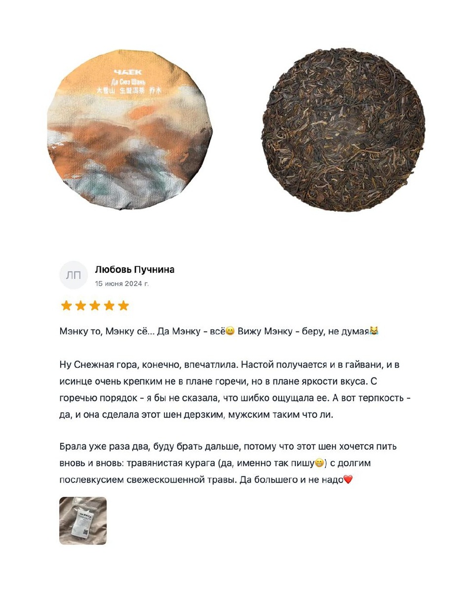» Вкус: мягкий и сочный, как тайваньские улуны. Чувствуются яркий свежий оттенок свежескошенной травы, сдержанные полевые цветы и нотки огуречной воды с можжевельником. Послевкусие держится долго, оставаясь на корне языка оттенками жасмина, свежескошенной травы и лёгкой вязкостью, которая постепенно переходит в прохладу. Особенности Шен пуэр из региона Мэнку Да Сюэ Шань (大雪山) произведён из осеннего сырья 2018 года, собранного с высокогорных прямоствольных деревьев Цяо Му (乔木). Их возраст составляет от 100 до 130 лет. Высота посадок — 2400 метров над уровнем моря. Да Сюэ Шань в переводе с китайского означает «Большая снежная гора» и является одним из ключевых чайных регионов округа Линьцан в провинции Юньнань. Именно здесь выращивают сырьё для пуэров, а также для красных и белых чаев. Горы поднимаются до 2500 метров над уровнем моря, где средняя температура держится на уровне 11 градусов. Местная почва крайне плодородная, она идеально подходит для выращивания чая. Регионы Да Сюэ Ш