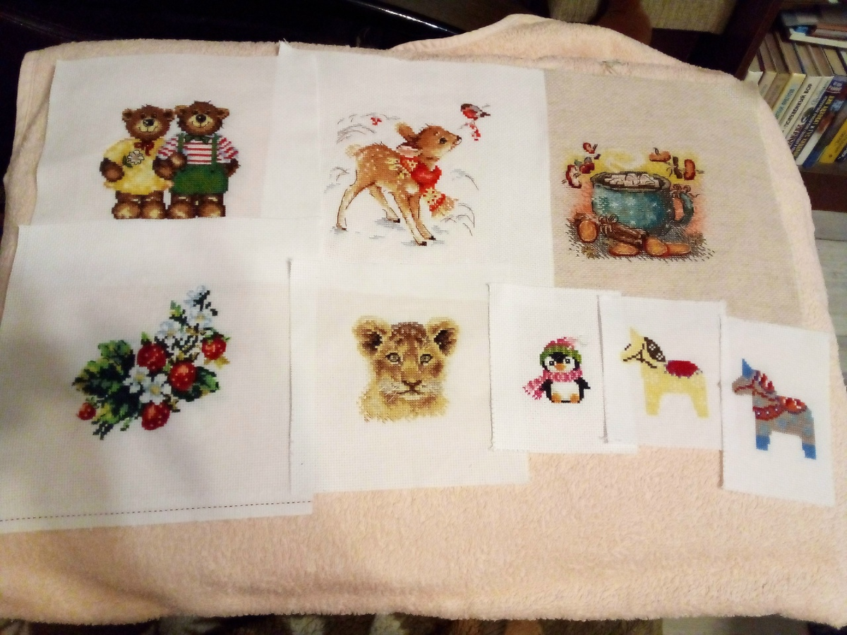 Довышивала замороченную чашку. Вроде мило и красиво, но не во всех аспектах я ей довольна. Решила сразу постирать и погладить и вспомнила, что с прошлого года не проводила вто. Пришлось сразу всему накопившемуся устроить порядок. Львёнок хоть и маленький, но немножко сложный. Зато какой плюшевый ррр-мяу получился))) Очень нравится, покупала его себе на день рождения. Точнее, взяла в "Читай-городе" за подарочные баллы. Сфотографирован на книге Максуда Ибрагимбекова "Пусть он останется с нами". Других книг про львов я не вспомнила. Оленьчик чудесный получился, добавила ему на фото сказочный лес. Мишек давно хотела вышить, не знаю, зачем они мне. Просто очень милые, вышились легко)))) А вот и первый финиш года. Уже говорила, что апельсины не похожи на апельсины. В целом много было мороки по цветам и блендам, ещё и нитки одной не хватило. Но вышло довольно мило. На новый год покупала себе тыкву и алые цветы. И хотела это всё сразу и вышить. Но котёночек посмотрел на меня из ящика и не оста