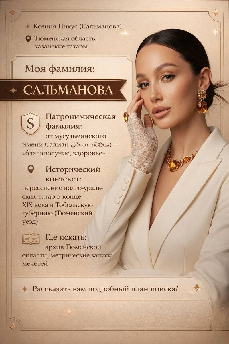 #полезныйпромпт@xeniia_neuro #полезныйпромпт Нейросеть за несколько минут может собрать информацию из открытых архивных источников и оцифрованных баз, сопоставить факты с историческим контекстом и выдать обоснованные гипотезы о происхождении вашей фамилии. Я решила взять девичью фамилию, Сальманова - фамилия моего папы. Просто отправьте этот промпт в режиме Deep Research / Глубокое исследование в ChatGPT (или аналогах с интернет-поиском): 🔎 Промпт (копируй и вставляй) Роль: Эксперт-генеалог и историк-ономаст. Задача: Провести глубокое исследование истории и происхождения фамилии [ВСТАВИТЬ ФАМИЛИЮ]. Контекст: География: [Регион, если известен / «Неизвестно»] Известные факты: [семейные легенды, сословие, миграция] Протокол исследования 1. Этимология: разбери лингвистический корень. Является ли фамилия патронимической, профессиональной, топонимической или прозвищной? Проверь славянские, тюркские и европейские корни. 2. География и расселение: определи исторические «очаги» распростр