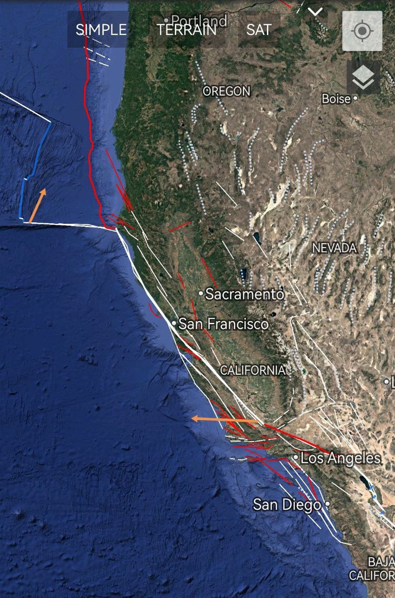 Подтверждается сильное тектоническое напряжение на западном побережье Северной Америки. Вчера перед закатом трассировались разломы вдоль Калифорнии (на уровне М7+). ====== Strong tectonic stress on the west coast of North America is confirmed. Yesterday, before sunset, faults were traced along California.