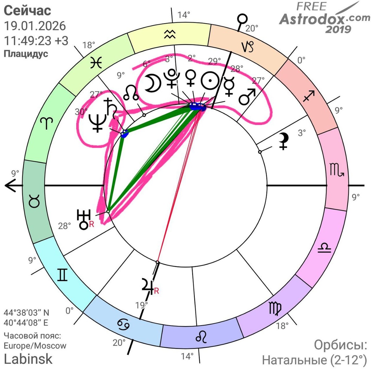я обвела треугольную конфигурацию розовым цветом, этот треугольник- шикарнейнейший аспект а ближайшие дни этот треугольник 10- ти кратно работает, потому что практически все планеты, что есть на небе собрались в двух знаках - в козероге и водолее и все друг с другом переплетены козерог - это структура, цели, планы, чёткость водолей - это новое, вперед, будущее, прорыв, ощущения честно, это крутая комбинация !!! пишите цели, планы, желания! только не сегодня, энергии маловато, тк луна только, только рождается а вот завтра, 19 января, можно уделить этому время сесть и спокойно написать свои цели на 2026 год кому я давала практику "дневник самопрограммирования " можно сделать по ней сейчас эта практика так же идет в подарок к соляру ☹️соляр сейчас стоит 3800 руб вместо 5700 руб козероги, водолеи и рыбы, вам самое время обзавестись прогнозом на ваш личный год писать мне 😢 @irissstep