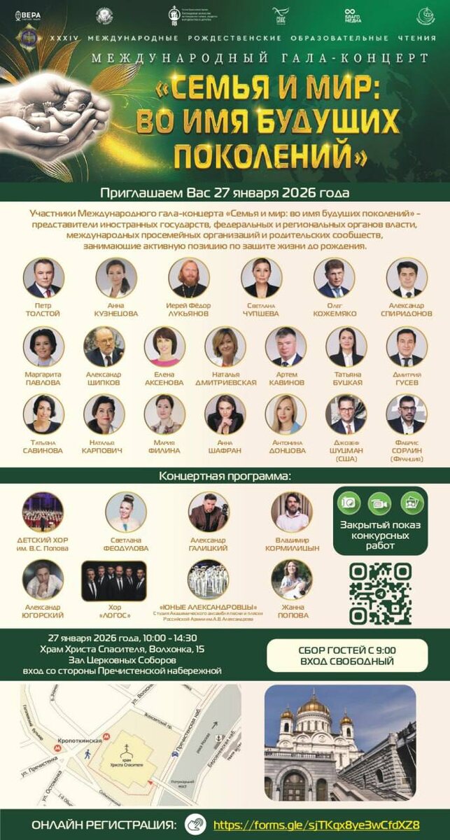ежегодный Гала-концерт-воззвание «Семья и мир: во имя будущих поколений». Мероприятие станет ключевым для консолидации всех, кто разделяет ценности крепкой семьи и защиты жизни с момента зачатия. ❕Вход свободный по обязательной предварительной регистрации (дети с 7 лет) Центральным событием вечера станет подведение итогов Всероссийского конкурса креативных индустрий «Семья – основа мира». 🏅 В рамках церемонии будут вручены награды губернаторам, меценатам и общественным деятелям, внесшим особый вклад в защиту жизни до рождения и поддержку многодетных семей. 🎤 В рамках концертной программы ожидаются выступления Большого детского хора им. В.С. Попова, детского хора студии «Юные Александровцы», хора «Логос», Светланы Феодуловой, Александра Галицкого, Владимира Кормилицына, Александра Югорского, Жанны Поповой. 🌐 Регистрация доступна по ссылке: forms.gle/sjTKqx8ye3wCfdXZ8