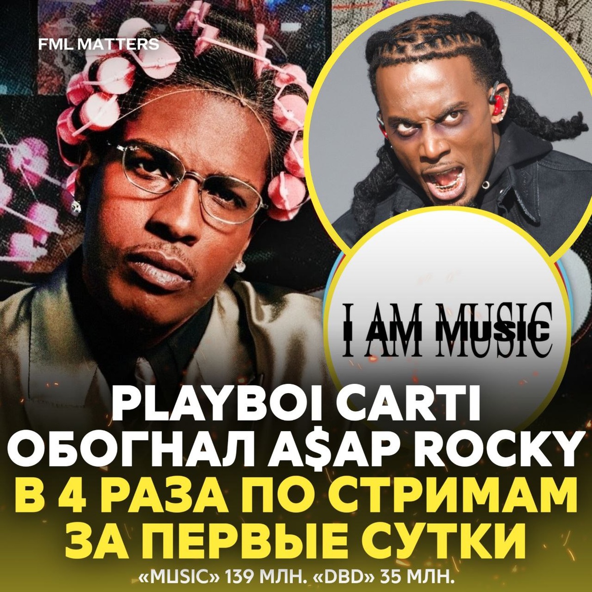 ☄️ PLAYBOI CARTI VS A$AP ROCKY: ЧИСЛА ГОВОРЯТ ЗА СЕБЯ! За первые сутки релиза Playboi Carti с альбомом «MUSIC» собрал 139 млн стримов на Spotify. A$AP Rocky с «DON'T BE DUMB» показал результат в 35 млн. Ещё до выхода на стримингах виниловые копии альбома Роки были раскуплены тиражом более 130 тысяч. У Карти за это же период по данным инсайдеров, предзаказы его бандлов (винил + мерч) оцениваются в 100–145 тысяч единиц, а в пиковую неделю только винил продавался тиражом ~16.5 тысяч копий. Чей альбом зашёл больше всего? 🤔 💀 FML MATTERS