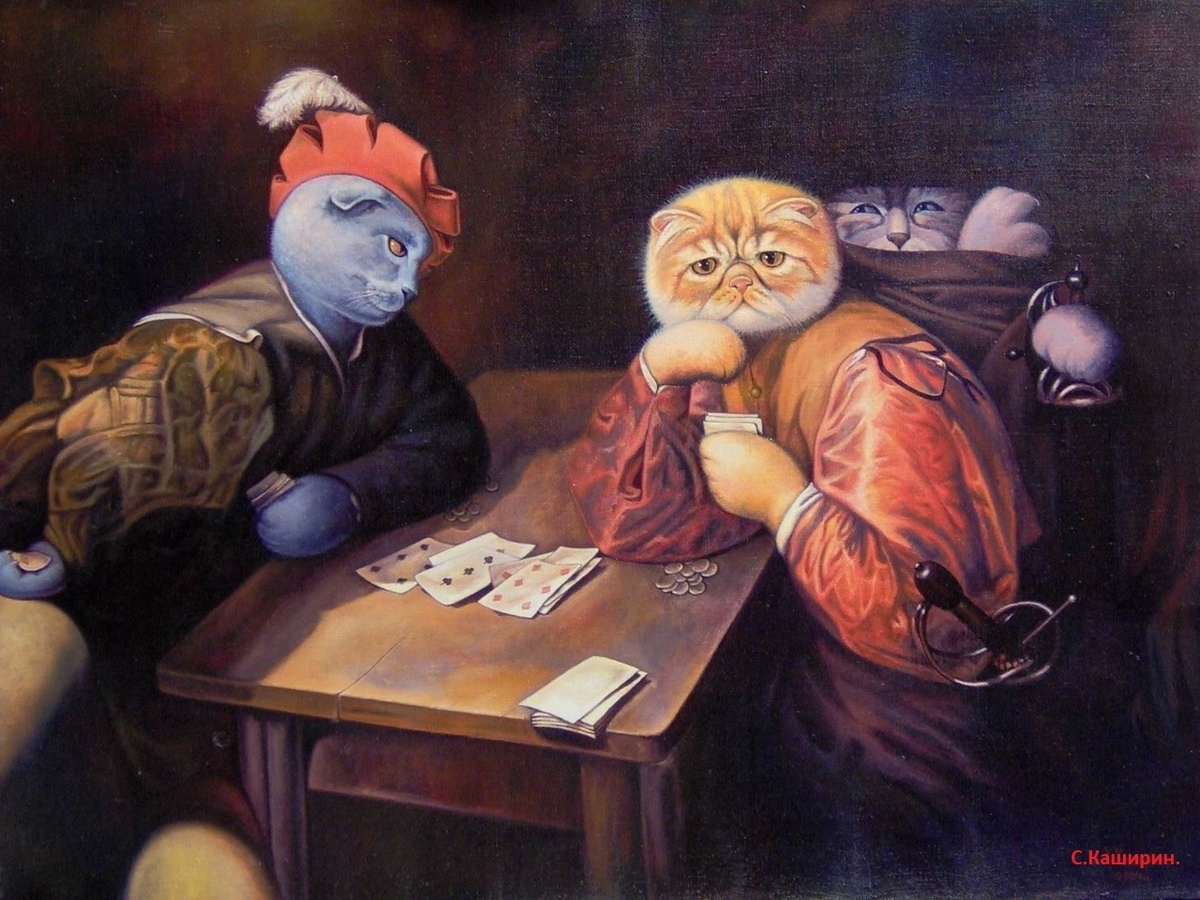 Отвлекусь на мгновение от темы проекта «Люди-кошки» и от антропоморфизма вообще. Помню процесс работы над этой картиной. Мне очень нравится приём - чередования тёплых и холодных цветов. В любой теме это самое чередование завораживает! В портрете, в пейзаже или в натюрморте холод рядом с теплом создаёт эффект декорации с подсветкой. Художники профессионалы меня поймут и начинающие надеюсь тоже. Да, существует закон живописи - единый цвет собирающий всю картину, но если при этом выделить ещё и чередование тёплого с холодным, то восприниматься глазом это будет лучше. Сильно уходя в рефлексы, можно картину "вывернуть", то есть "сломать" цветовой баланс, но если умело собрать работу по её краям лессировками одного цвета и слегка притенить, то можно и закон живописи соблюсти, и выделить нужный объект, и показать контрастность. В пейзаже и в натюрморте это сработает лучше всего.
