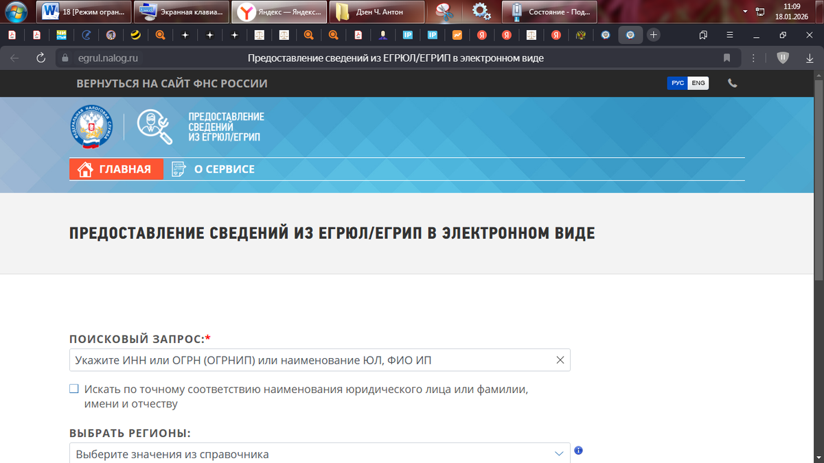 Получаю доступ на земле через World Wide Web (Всемирная Компьютерная Сеть) в информационно-телекоммуникационную сеть Internet («Интернет») и через соответствующую поисковую систему (браузер) на страницу сайта URL - адрес: https://egrul.nalog.ru/index.html Предоставление сведений из ЕГРЮЛ/ЕГРИП в электронном виде. Фотографию от 18.01.2026 г. сайта прилагаю следующую. Есть Федеральный закон "Об информации, информационных технологиях и о защите информации" от 27.07.2006 N 149-ФЗ. В силу названного ФЗ ст. 2. в настоящем Федеральном законе используются следующие основные понятия: 17) владелец сайта в сети "Интернет" - лицо, самостоятельно и по своему усмотрению определяющее порядок использования сайта в сети "Интернет", в том числе порядок размещения информации на таком сайте. Можно не задумываясь сказать, владельцем сайта является Федеральная налоговая служба или ФНС России, но это надо перепроверять. Так, полагаю я получаю имя поддомена (домен третьего уровня): EGRUL.NALOG.RU или egrul.