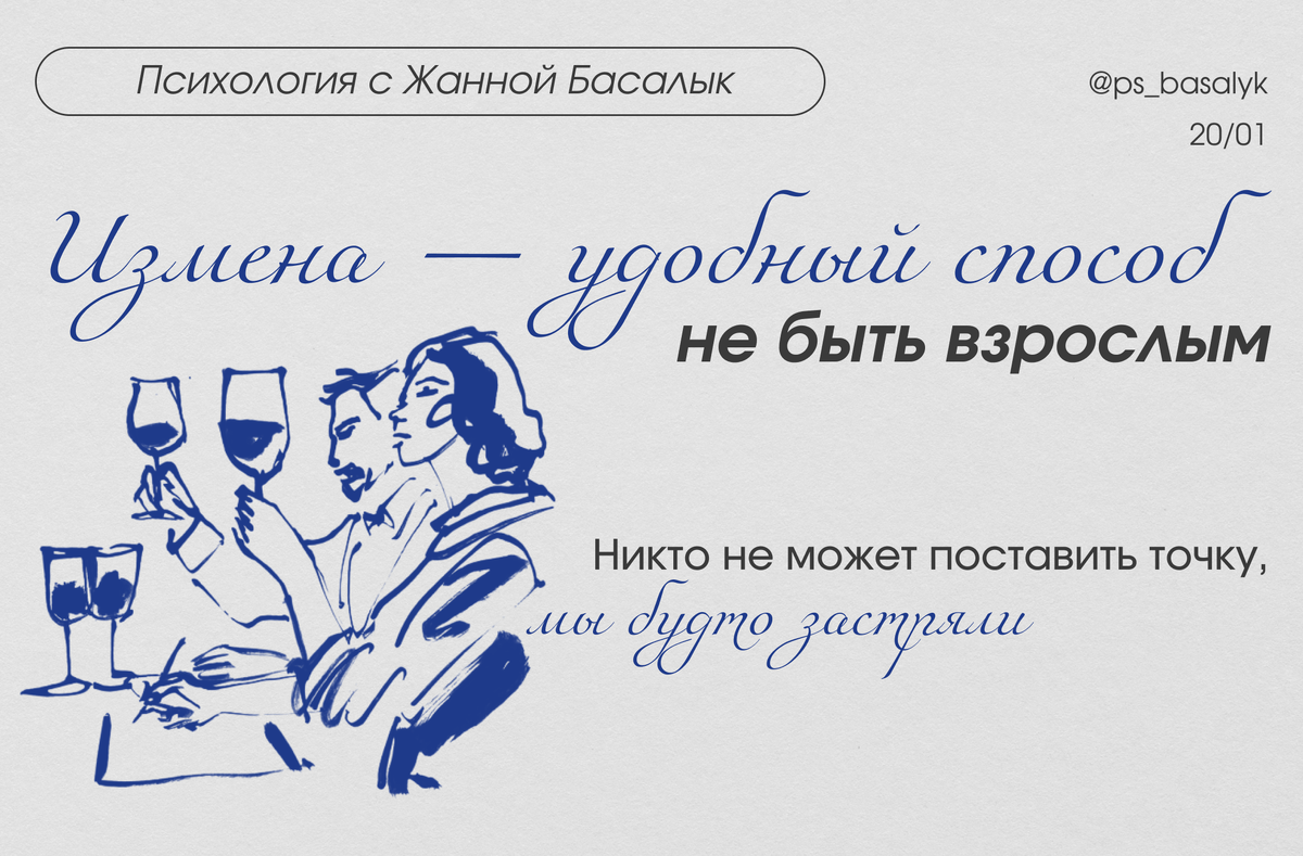 После публикации о том, что измена может быть стратегией выхода из отношений, мне начали писать люди с похожими историями. Разные судьбы, разный опыт — но почти всегда один и тот же вопрос: «А почему он не ушёл, а изменил?».