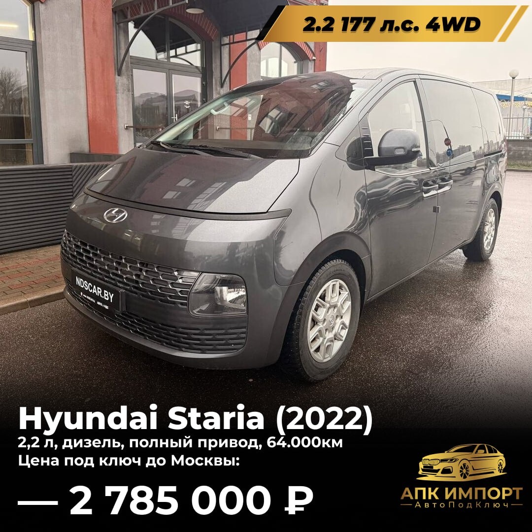 ) 📍 Основные характеристики: 🔹 Год выпуска: 2022 🔹 Пробег: 64,000 км 🔹 Двигатель: 2.2 л дизель, 177 л.с. 🔹 Привод: постоянный полный (4WD) 🇧🇾 Автомобиль в наличии, на белорусском учёте. Hyundai Staria создавался с расчётом на максимальную обзорность — площадь остекления у него одна из самых больших в классе, из-за чего модель часто выбирают для VIP-трансферов в Корее. ➡️ Комплектация: электронный климат-контроль, подогрев и вентиляция передних сидений, подогрев руля, электропривод передних сидений и зеркал с подогревом, датчики дождя и света, круиз-контроль, удержание в полосе, мониторинг слепых зон, распознавание дорожных знаков, выбор режимов движения, полный набор систем безопасности (ABS, ESP, TCS, HAC). ⬇️ Больше фотографий в комментариях 💰 Цена: 2,785,000 рублей под ключ с доставкой до Москвы и полным комплектом документов! 🚗 Пишите в личные сообщения для консультации и заказа! #вналичии #апкимпорт