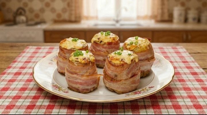 — Невероятно аппетитная закуска: нежный картофель в душистом соусе, обёрнутый хрустящим беконом и покрытый сырной корочкой. ~350 руб. ~КБЖУ на всю порцию (5-6 шт.): 1500 ккал / Б: 50 г / Ж: 100 г / У: 80 г Ингредиенты: Картофель варёный в мундире — 6 шт. (~600 г) Сметана — 3 ст.л. Майонез — 3 ст.л. Укроп свежий — пучок Чеснок — 2 зубчика Специи (паприка, перец) — по вкусу Бекон слайсы — 100 г Сыр твёрдый тёртый — 100 г Смешайте сметану, майонез, рубленый укроп, давленый чеснок и специи. Картофель очистите, обваляйте в соусе. Каждую картофелину заверните в ломтик бекона. Выложите в форму, смажьте остатками соуса, посыпьте сыром. Запекайте при 200°C 10–15 минут до расплавления сыра и румяности бекона. Рецепты по карману