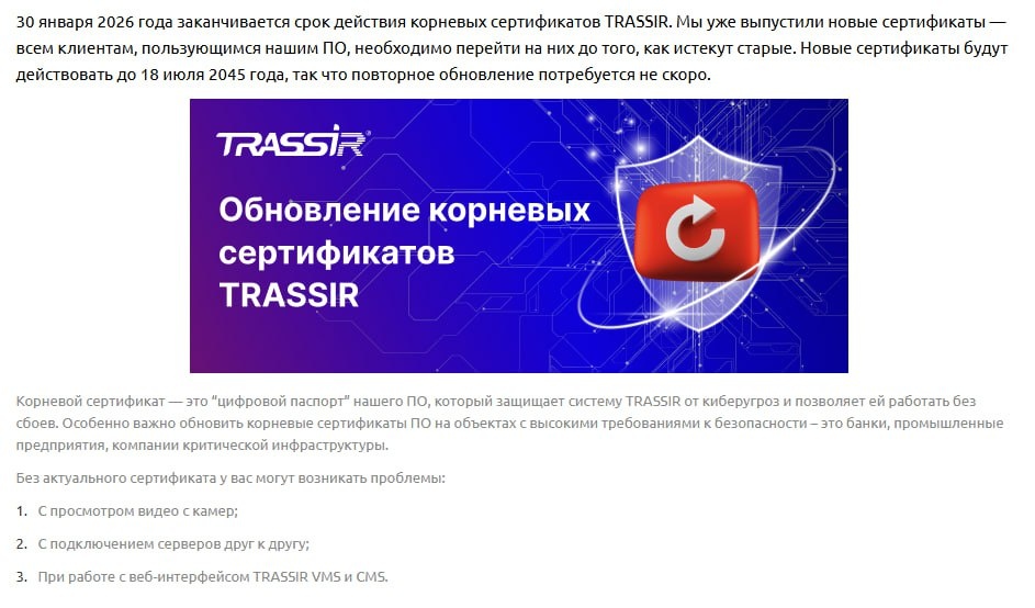 Ну, так... на всякий случай. Время ещё есть, но лучше не откладывать на последний день. ‼️30 января 2026 года заканчивается срок действия корневых сертификатов TRASSIR‼️ Возможные проблемы если не обновить: - просмотр видео с камер - подключение серверов друг к другу - работа с web-интерфейсом 🟢 с версии ПО TRASSIR 4.7.2.0 сертификаты уже обновлены и дополнительно обновлять их не нужно. 🔴 для продуктов TRASSIR CMS и TRASSIR LM обновление особенно критично, без него они перестанут корректно работать. Мануал по обновлению 👉 ссылка