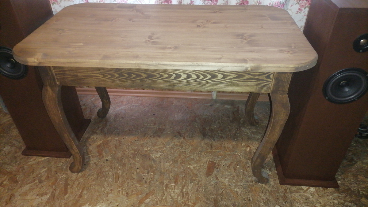 Ножки с изгибом. Прежде чем выпилить их, я разрезал картонную коробку на полоску шириной 15 см и длиной 75 см. Нарисовал ножку просто от руки, без каких-либо расчетов. Выпилил лобзиком из доски толщиной 40 мм. Далее соединил шкантами, предварительно промазав доски клеем. Столешница из сосны, куплена в магазине готовая. Стол обработал наждачкой и покрыл двумя слоями масла.
