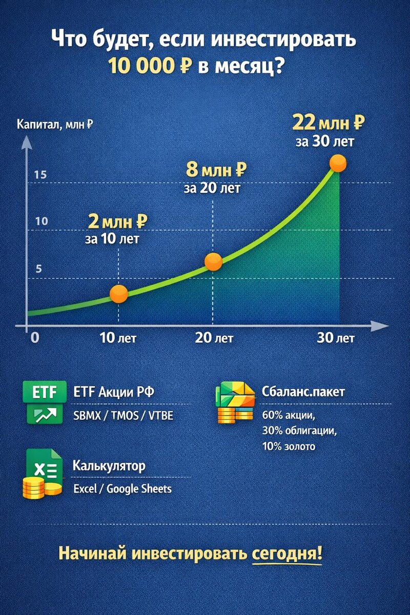 Именно поэтому регулярные инвестиции по 10 000 ₽ в месяц, начатые как можно раньше, часто выигрывают у «поздних рывков» с большими суммами.