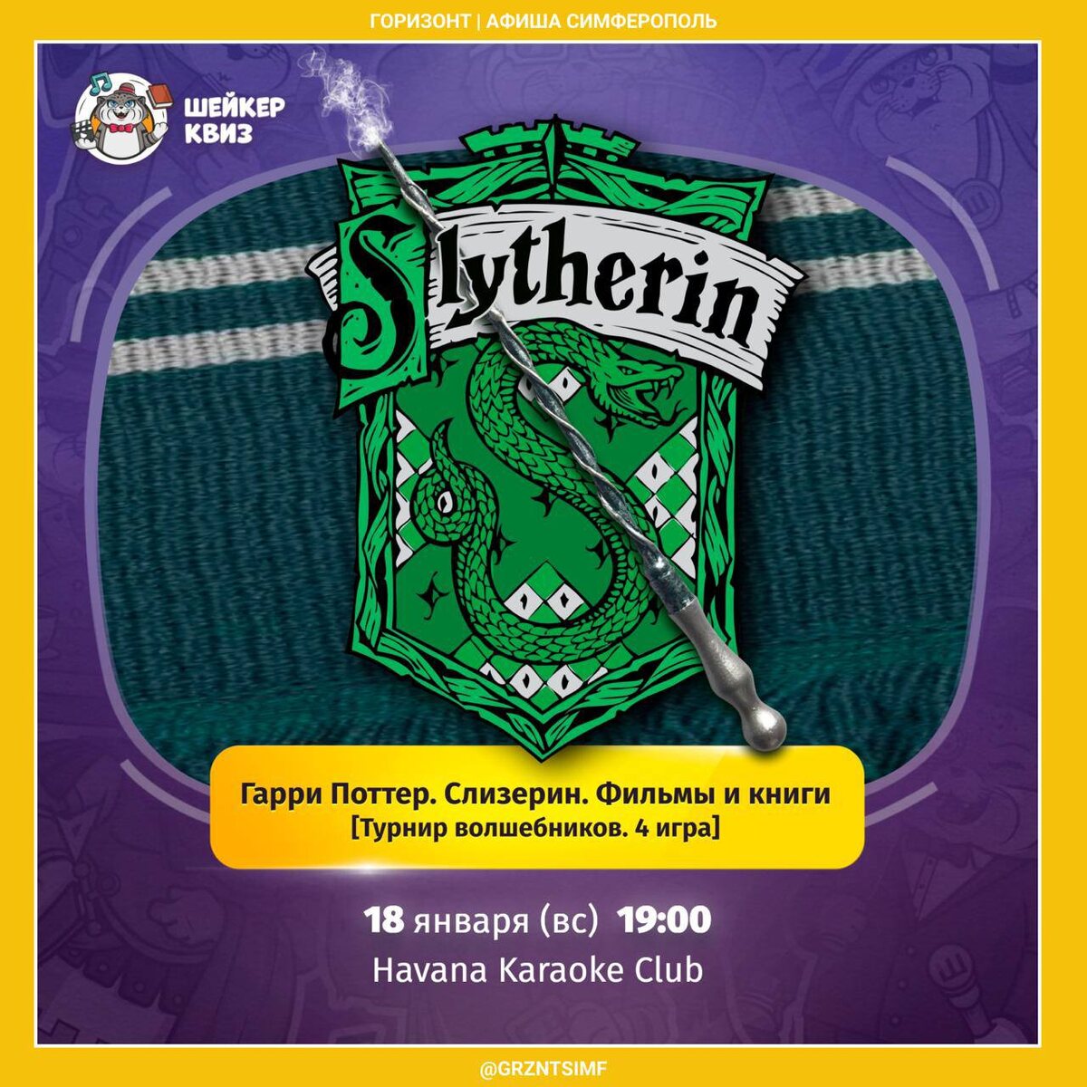 Когтевран. Фильмы и книги [Турнир волшебников. 4 игра] А теперь Распределяющая шляпа отправит вас на Слизерин. Заглянем в учебные классы, в гостиную, на поле для квиддича, пообщаемся с Кровавым бароном и не только. Вас ждут вопросы на эрудицию, смекалку и логику по книгам и фильмам о Гарри Поттере. Держите палочки наготове! 👉 Когда? 18 января в 19:00 👉 Где? Карла Маркса 51, Havana Karaoke Club 👉 Регистрация, Вход: 500₽ ✨Давай сходим | Крым