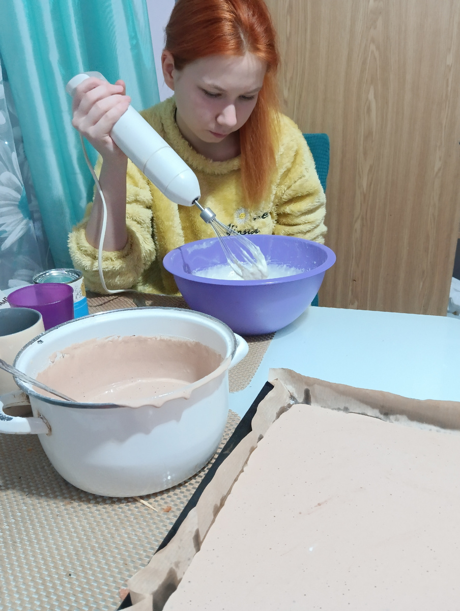 Добавили взбитые желтки, муку, какао и испекли два рулета полумеренговых😁