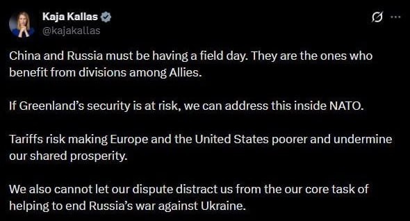 Они получают выгоду от раздора среди союзников", — глава дипломатии ЕС "Если безопасность Гренландии окажется под угрозой, мы можем решить это в рамках НАТО. Тарифы угрожают сделать Европу и США беднее и подрывают наше общее процветание. Мы также не можем допустить, чтобы наш спор отвлек нас от главной задачи — помощи в прекращении войны России против Украины", — заявила глава дипломатии ЕС Кайя Каллас. ♥️ Радио Жизнь | Бот Жизни