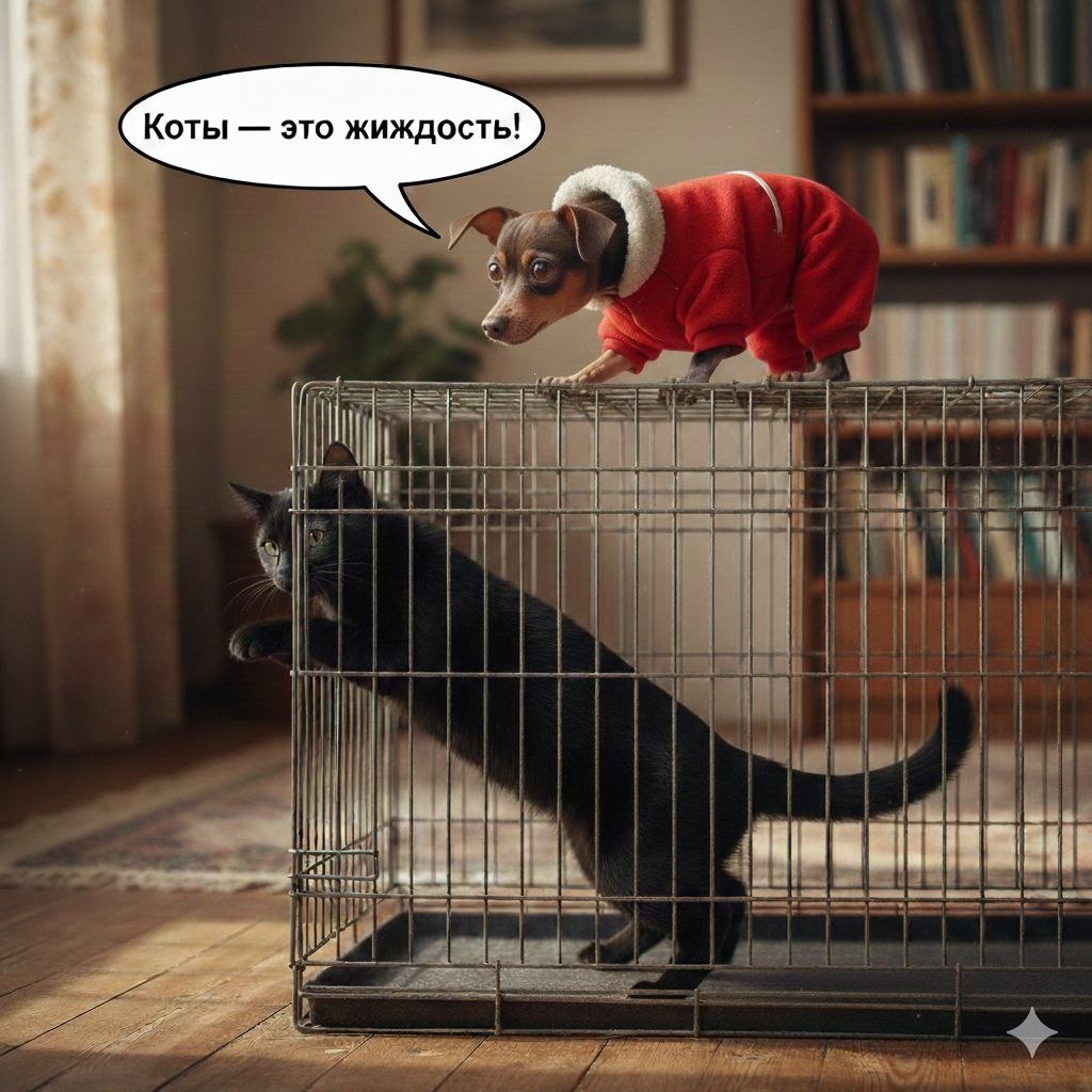 Вчера наша Кожаная Седая в Александровском решила поиграть в службу безопасности. На улице мороз — жуть, и она, сердобольная душа, поймала Малыша Черномырдина (нашего знатного трусишку, который от собак бегает быстрее, чем видит), и заперла в клетку. Для его же блага! Сцена первая: Инструктаж от Лысого Как только Седая ушла «стоять за дверь» (на работу это у них называется), над клеткой материализовался Иннокентий. — Слышь, Черномырдин, — прошипел лысый суетолог, — ты чего там замер? Кто сказал, что коты — это твердое тело? Коты — это жидкость! Давай, втягивай харизму и просачивайся между прутьями. Главное — пузо прижать, а то застрянешь, как пробка в бутылке, и будешь до вечера изображать меховой декор. Сцена вторая: Великое просачивание Под издевательское хихиканье Иннокентия, Малыш начал спецоперацию. Это было шоу «Сила есть — ума не надо». Черномырдин вытягивался, сплющивался и буквально молекулярно распадался. С тихим звуком «чпок» кот вывалился из закрытой клетки на свободу