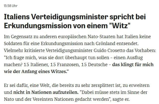 Издание пишет, что Италия не стала посылать своих военных на остров на фоне угроз Трампа. «Интересно, что они вообще там должны делать – отправиться в экспедицию? 15 итальянцев, 15 французов, 15 немцев – это звучит как начало шутки», – заявил Гвидо Крозетто. Напомню, ряд европейских стран заявил об отправке в Гренландию от 1 до 15 военных. 🤗 НАСОНОВ 🔴