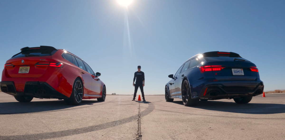 BMW M5 Touring обошла Audi RS6 Avant в U-драг — 402 метра с разворотом. Почему гибрид BMW быстрее несмотря на то, что на 270 кг тяжелее соперника? Два семейных универсала‑монстра — BMW M5 Touring и Audi RS6 Avant — сходятся в U‑образном драг‑рейсинге. Формат от Edmunds прост и беспощаден: рывок на четверть мили (402 м) вперёд, резкий 180° разворот и возврат назад — итого 804 м, где проверяются не только лошади, но и тормоза, управляемость и хватка шин. BMW M5 Touring (G99, 2025 модельный год) — свежий гибридный зверь с 4,4‑литровым V8, электромотором, суммарно 738 л.с. и 1020 Нм, весом 2770 кг и ценой тестового экземпляра 145 775 долларов. Против него — Audi RS6 Avant Performance (2025, 4,0‑литровый V8 битурбо, 630 л.с., 850 Нм, 2500 кг, цена — 167 140 долларов). Кто победит: тяжёлый, но мощный BMW или лёгкий, но «старый добрый» Audi quattro? Смотрим видео и разбираем по секундам! Старт — самый драматичный момент. BMW M5 с её гибридной системой даёт мгновенный электробуст, но лишние