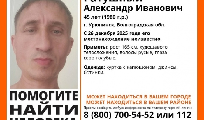 Местонахождение Александра Ратушного из Урюпинска неизвестно с 26 декабря 2025 года. Как сообщает ПСО «ЛизаАлерт», ведутся поиски 45-летнего Александра Ратушного из Урюпинска. Местонахождение мужчины неизвестно с 26 декабря 2025 года. Приметы пропавшего: рост 165 см, худощавое телосложение, русые волосы, серо-голубые глаза. В день исчезновения на мужчине были куртка с капюшоном, джинсы, ботинки. Всех, кто располагает информацией о местонахождении Александра Ратушного, просят сообщить по телефону 8 800 700 54 52 или 112.
