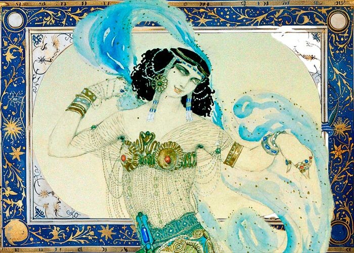 Замечательному Льву Баксту первое признание в области театра принес костюм Саломеи для номера, поставленного хореографом Михаилом Фокиным. Вероятно, это тот случай, когда помог запрет. Драма Уайльда с музыкой Глазунова готовилась к постановке в Михайловском театре в 1908-м году. Однако из-за цензуры антреприза не состоялась: тут и царь Ирод на троне, и уальдовская трактовка сюжета… Спасти тогда удалось лишь одну картину — «Танец семи покрывал», которую инициатор проекта — предприимчивая Ида Рубинштейн — сумела представить в концертной программе в Большом зале Петербургской консерватории. Это было феерическое выступление, не означающее, правда, сокрушительного успеха! Тут требуются некоторые пояснения. Уже в эскизе, сделанном Бакстом, заметна колдовская пленительность царевны, соблазняющей свою жертву (как известно, коварная Саломея стремилась побудить Ирода исполнить любое ее желание, а ей нужна была голова Иоанна Крестителя!). И вот она уже начинает свой номер, разворачивая с магическ