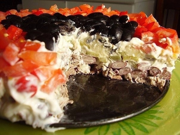 6-й слой - помидорки , порезанные кубиками, и маслины( маслины порезать, выложить в форме сердца)