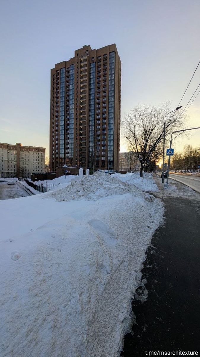 Возвращаемся с реновацией! Сегодня хороший середнячок с приятным фасадом. Увы, просто свечка, но можно найти некоторое архитектурное разнообразие формы внизу торца, расположенного у дороги. Там на первых 5ти этажах окна утоплены сильнее, скорее всего это следствие тех. требований. Работу с рельефом оценить сложно из-за снега, но подпорных стенок много, заморачивались явно не сильно. 📱 Архитекстура #Москва #реновация