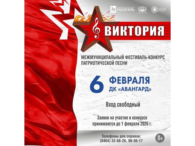 Творческих жителей Сызрани приглашают принять участие в очередном межмуниципальном фестивале-конкурсе патриотической песни «Виктория». Популярный конкурс помогает выявить ярких исполнителей песен патриотического содержания, популяризует песни о Великой Отечественной войне, о Родине, Самарском крае, Российской армии. В этом году конкурс проводится в пяти номинациях: «солисты», «вокальные ансамбли», «вокально-инструментальные ансамбли», «инструментальные ансамбли», «авторы - исполнители». В «Культурно-досуговом комплексе» Сызрани перечислили всех, кто имеет право участвовать в «Виктории». К участию в конкурсе приглашаются все желающие - любители вокального творчества: военнослужащие и члены их семей, курсанты высших военных заведений, гражданский персонал Вооруженных сил, сотрудники федеральных служб и правоохранительных органов, студенты вузов и спу, а также любительские творческие коллективы независимо от ведомственной принадлежности (детские школы искусств, дома культуры, дворцы творч
