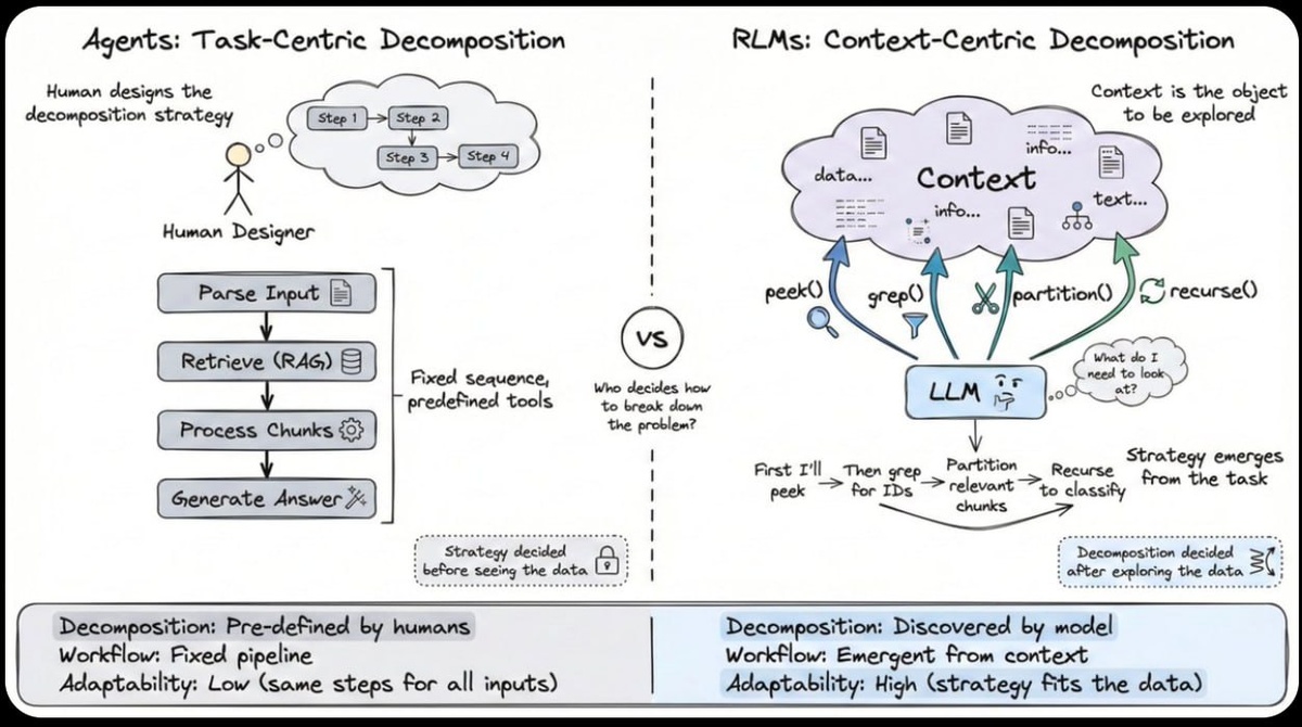 ей разбить контекст на более мелкие части и обрабатывать их рекурсивно. Ключевое изменение — это контекстно-ориентированная декомпозиция: Агенты декомпозируют задачи на основе шагов, разработанных человеком. RLM позволяют модели декомпозировать сам контекст. Модель становится программистом, анализирующим набор данных, а не студентом, зубрившим материал к экзамену.
