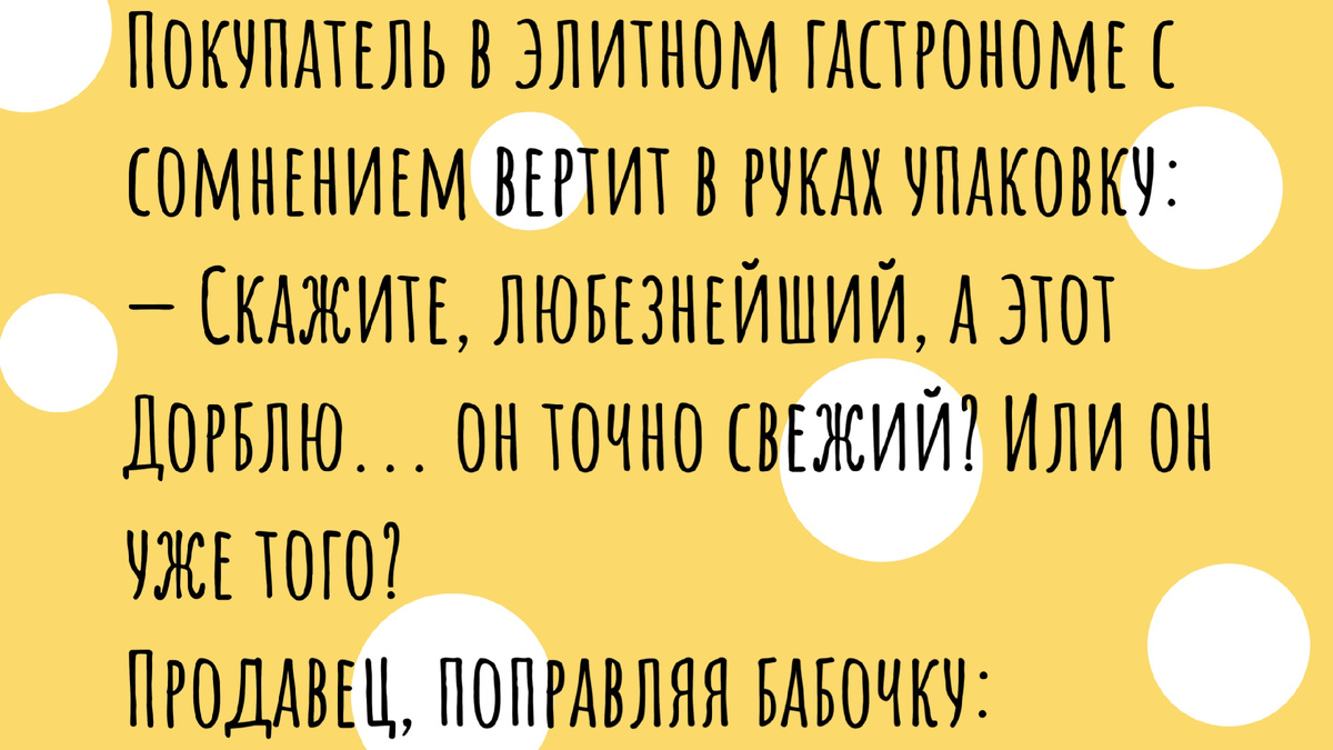 Эта шутка — мой личный фаворит, потому что она идеально описывает любую диету. Вы замечали, как наш мозг начинает генерировать подобные логические цепочки, когда нам очень хочется съесть что-то запрещенное? «Если я съем этот кусок торта, то стану тяжелее. Если я стану тяжелее, гравитация будет действовать на меня сильнее. Значит, это не я толстый, это просто физика против меня!». С сыром та же история: мы покупаем швейцарский сыр, платим за вес, а по факту половину денег отдаем за воздух. Но какой это вкусный воздух! Получается, сыровары — единственные люди в мире, которые научились легально продавать пустоту и при этом делать людей счастливыми.