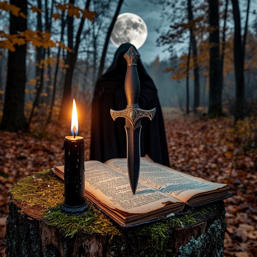 Костя стоял в лесу, и холод октябрьской ночи проникал под кожу, но это было ничто по сравнению с ледяным огнём в груди. Для ритуала требовался кинжал. Редкий обсидиановый кинжал, который Костя не мог достать. Но всегда есть возможность сделать самому, решил он. В руке он сжимал самодельный кинжал — обсидиановое лезвие, примотанное изолентой к старой деревянной рукояти. Перед ним на пне, покрытом мхом, горела чёрная свеча, отбрасывая пляшущие тени на страницы потрёпанного манускрипта, украденного из краевой библиотеки. Воздух пах озоном и гниющими листьями.