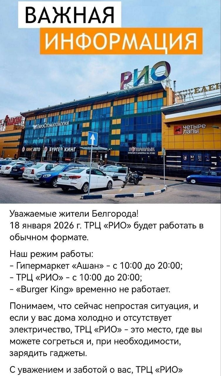 🔹 Крупные торговые комплексы в Белгороде снова вынуждены работать по сокращенному расписанию. Причиной этого стало уменьшение подачи электроэнергии в городские сети. Руководство развлекательно-торгового центра «СитиМолл», а также администрации торговых комплексов «Гринн» и «РИО» разместили в своих официальных сообществах в социальных сетях перечни магазинов, которые продолжают обслуживать покупателей. Там же можно ознакомиться с актуальным на текущий момент графиком их работы. ______________ 🦁 подпишитесь на 👉 Белгородский край