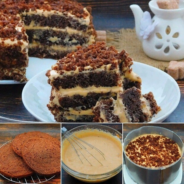 Неровную "шапочку" срезать и измельчить руками, крошки понадобятся для украшения. Сам корж разделить в горизонтальной плоскости на 3 равных части.