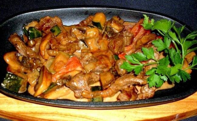 Влейте вино и тушите 5 минут. Затем добавьте шампиньоны, тимьян, брокколи, перец, лук, посолите. Тушите под крышкой 20-30 минут.