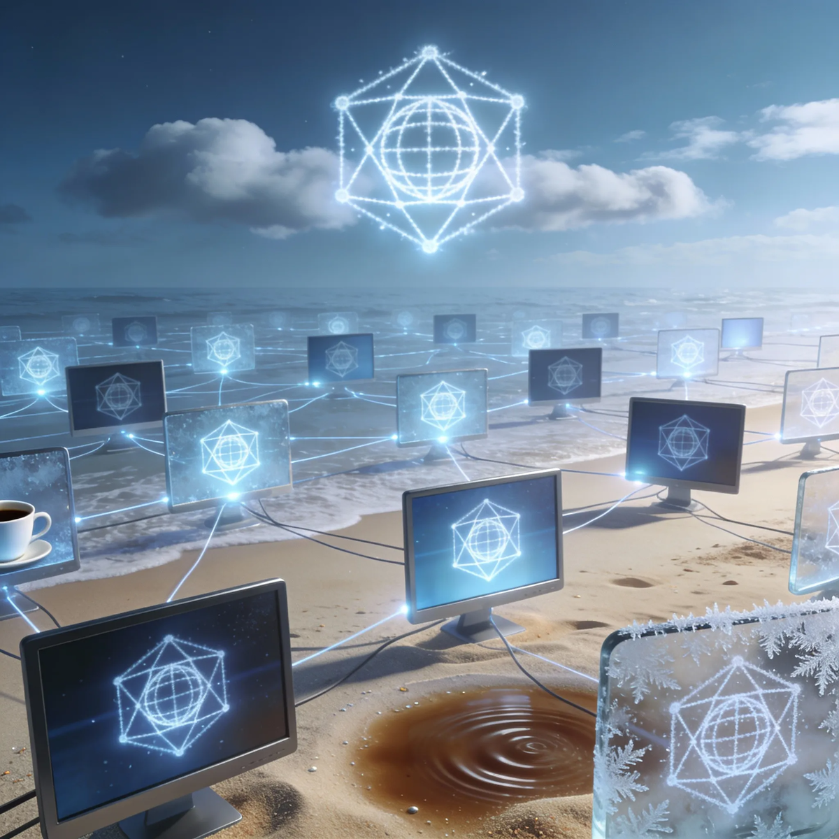 - Кофе в чашках, песок на пляжах, даже узоры мороза на стёклах — везде проявлялся тот же символ: сфера, заключённая в додекаэдр, пронизанный pulsating-сетью линий.