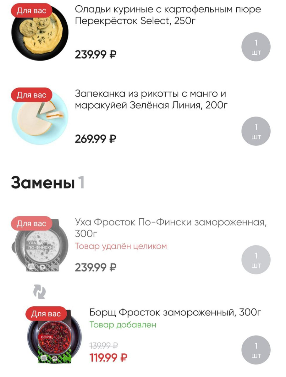 Готовая еда за 10 рублей, груши по 18 рублей за килограмм. И отзывы на банки, за которые мне заплатили по 500 рублей. У меня в приложении Перекрёстка было персональное предложение - кешбэк 80% на готовую еду из подборки. Я уже видела раньше такое же предложение у других, у меня появилось только сейчас. Так что если у вас его нет сейчас, возможно, оно ещё появится. Максимальный кешбэк 500 рублей, значит выгоднее всего покупать на 600 рублей с небольшим. Я выбрала такой набор: Уху заменили на борщ, не совсем то, что я хотела, но по цене вышло даже выгоднее, потому что заказ стал дешевле. Хотя минимальный заказ был от 700 рублей, после сборки он стал 600 рублей - то, что нужно. В корзине применила промокод на 10% (он появился при оформлении). Предварительно не отображалось сколько начислят Апельсинок, но я знала, что всё делаю верно, так что их начислят. А если нет - ну и ладно, нажаловалась бы в статье. Заказ вышел на 608 рублей, я оплатила картой ВТБ с кешбэком 7% на продукты. Итого п