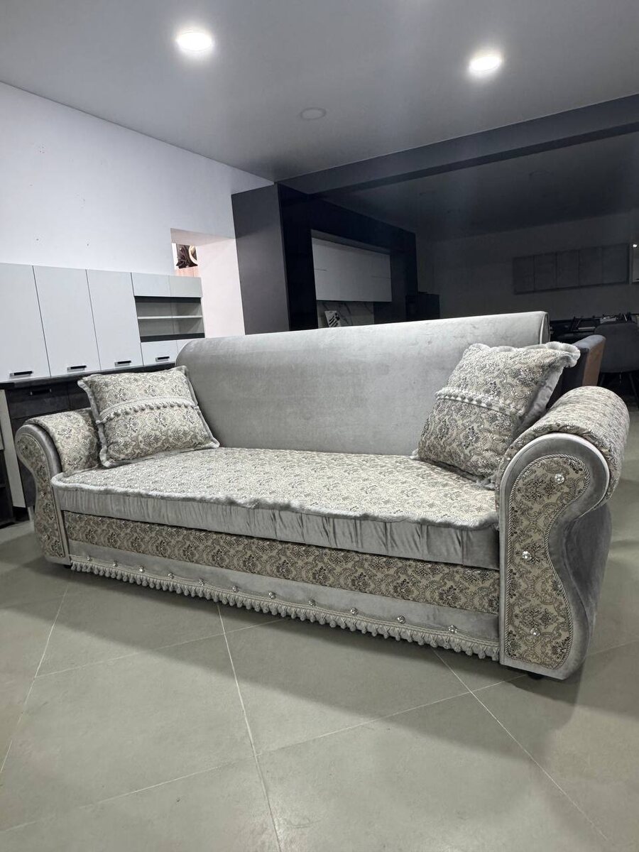 сочетание классики и современного дизайна.Диван обтянут тканью с узором, который напоминает старинные орнаменты, На нем расположены декоративные подушки, которые также имеют узор, гармонирующий с обивкой. Это добавляет уют и завершенность композиции.
