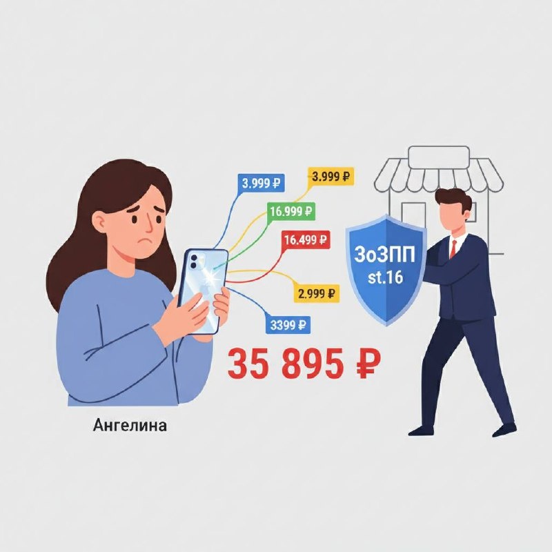 Уверена, многие сталкивались с подобным. 📱 История Ангелины и "волшебного" телефона Apple Ко мне обратилась девушка. История, как две капли воды похожая на многие другие: человек покупает новый, долгожданный телефон (в данном случае, Apple) и на кассе ему под шумок "продают" целый ворох дополнительных услуг. Причем так, что отказаться практически невозможно, или создается впечатление, что без них покупка телефона — ну просто немыслима! 💰 Что "навязали"? Список услуг на почти 36 000 рублей! Среди них:Адаптация E-Sim — 3 999 рублей, Активация техники Apple — 2 999 рублей, Мультисервис премиум — 16 499 рублей, Настройка для отключения банковских услуг — 8 999 рублей, Поклейка стекла — 3 399 рублей. Итого: 35 895 рублей за то, что, по сути, не было нужно и уж точно не было осознанно выбрано. ⚖️ Что говорит закон? Тут на помощь приходит Закон РФ «О защите прав потребителей». * Согласно абзацу 4 части 3 статьи 16, продавец не имеет права без согласия потребителя навязывать дополн