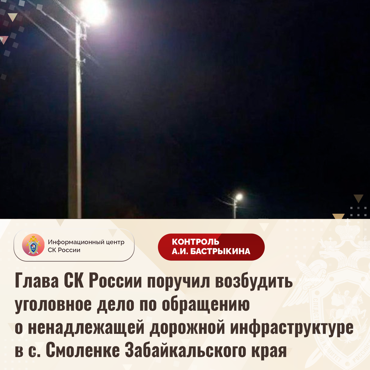 Глава СК России поручил возбудить уголовное дело по обращению о ненадлежащей дорожной инфраструктуре в с. Смоленке Забайкальского края В Информационный центр СК России поступило обращение по вопросу нарушения прав жителей села Смоленка Забайкальского края на качественную дорожную инфраструктуру. Автомобильная дорога «Смоленка-Карповка» не оборудована освещением и тротуарами, что представляет опасность для пешеходов. Отмечается, что из-за отсутствия осветительных приборов в ноябре прошлого года водитель легкового автомобиля сбил 14-летнюю девочку. От полученных травм пострадавшая скончалась. Кроме того, при тех же обстоятельствах ранее пострадал другой ребенок. Обращения в различные инстанции результатов не принесли, в декабре работы выполнены только частично, при этом мощности фонарей для освещения дороги в темное время суток недостаточно. Указанная ситуация освещалась в СМИ. В СУ СК России по Забайкальскому краю организована процессуальная проверка. Председатель Следственного комитет