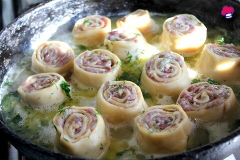 • Раскатайте тесто на присыпанном мукой столе, равномерно распределите фарш, скрутите в рулет.