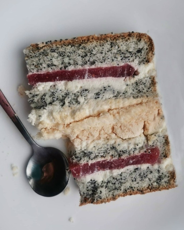 13. В оставшийся крем добавить 1 ст.л. мака и обмазать торт сверху.