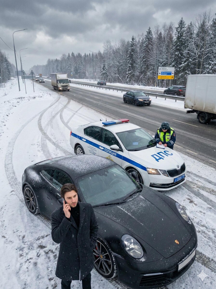 ⚡️ Решил повторить, но не так киношно как все, а более реалистично)) Промпт 1 (для 1го фото) (нажмите чтобы скопировать) Extreme high-angle drone shot, cinematic film still, snowy Russian highway in winter, overcast sky, heavy clouds, cold desaturated color grading, realistic natural light, snowy asphalt with visible tire tracks, light snowfall, Eastern European atmosphere; black matte Porsche 911 Carrera 4S parked on roadside with light snow dust on body, subtle matte reflections, rear view slightly angled; behind the Porsche stands a standard Russian DPS police car Skoda Octavia, white with blue stripes, roof light bar, clearly readable Cyrillic text “ПОЛИЦИЯ” on doors and “ДПС” on hood, NO blue stripe covering or crossing the hood letters, text fully unobstructed, patrol car positioned strictly behind the Porsche; Russian traffic police officer in winter DPS uniform with reflective vest leaning on the hood writing a report, realistic posture and anatomy; first male character stan