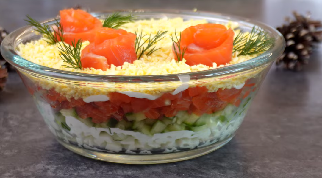Предлагаю обратить внимание на этот вкуснейший салат. В его основе всего три ключевых продукта: слабосоленая форель, свежий огурец и яйца. Сочетание нежнейшей рыбы, сочной хрустящей зелени и яичных белков создает гармоничный и свежий вкус. А подавать его можно как в общем блюде, так и эффектными порциями в прозрачных креманках или стаканах. Яйца 4 шт. отварим, отделим белки от желтков. Желтки убираем в сторонку, белки порежем кубиками. Кладем первым слоем в салатник, смазываем майонезом. Свежий огурец 200 грамм порежем кубиками, укладываем вторым слоем. Майонезом не смазываем, так огурцы сами по себе сочные. Теперь порежем кубиками форель слабосоленую. Форель я солю сама, во- первых это недорого получается, во-вторых вкусно, а в-третьих это совсем не сложно. Если интересно, загляните сюда 👉 Правильный способ засолить форель. Кладем третьим слоем подготовленную форель, смазываем майонезом. Теперь яичные желтки натрем на терке и укладываем четвертым слоем. Сверху украшаем розочками