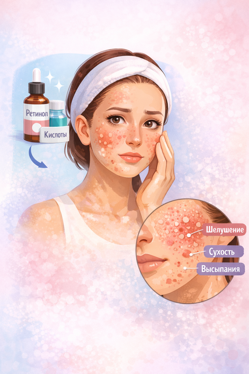 Мы с вами много говорили о разных компонентах косметики, в том числе и о ретиноле, при использовании которого, а также кислот, может возникнуть период адаптации (шелушение, сухость, мелкие высыпания).