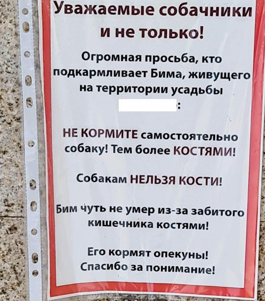 ... Буквально на днях, накануне Рождества, мы заехали в одну из московских усадеб. Красивый особняк, вокруг - парк. А главная достопримечательность - чудесный пёс, с которым мы знакомы лет 5. У него своя будочка, его там любят. Но в этот раз над местом, где стоят мисочки пёселя, мы прочитали объявление и сердце сжалось: "Опять!" Опять бездомных животных "добрые люди" кормят помоечными отбросами. Видимо, выбросить жалко - деньги плОчены, пусть хоть бездомыши съедят. И они едят. А потом - болеют и умирают... ... На попечении фонда живёт старичок Макс. Он тоже обитал во дворе, его кормили тем, что на помойку не доносили. И поступил к нам Макс в тяжелейшем состоянии, едва-едва спасли. Теперь пёс - инвалид. Обратно его мы его, конечно же, не вернули, так и живёт у нас. ... А после Новогодних праздников то тут, то там стоят пластиковые упаковки с отбросами с барского стола. Стоят и воняют. Это "доброхоты" кормят котиков. Понятно, что жители первых этажей бьюся в истерике и требуют убрать..