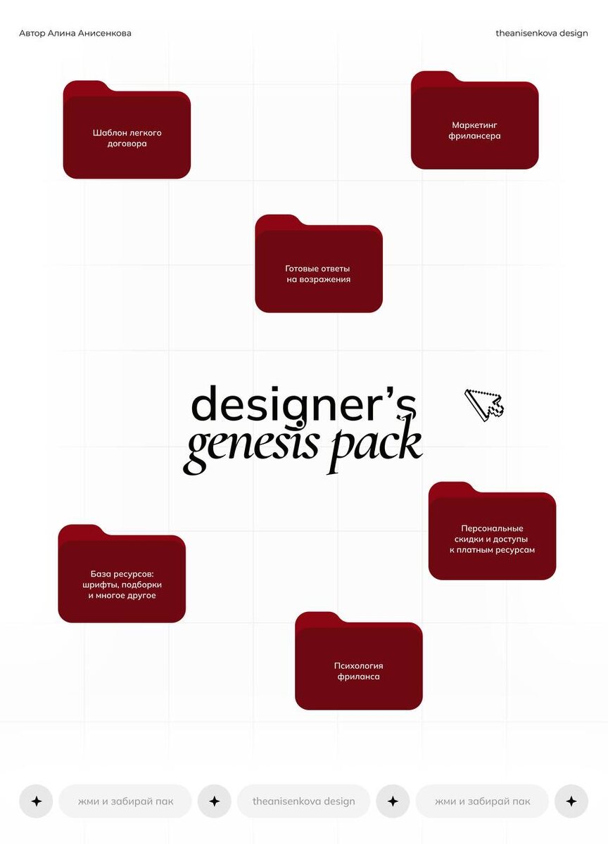? 🤯 Сделал крутой макет, а клиент просит «подешевле»? Или работаешь без договора, а потом правки длятся вечно? Я упаковала решение этих проблем в DESIGNER’S GENESIS PACK. Это ваша шпаргалка для перехода на новый уровень Внутри DESIGNER’S GENESIS PACK: ✅Шаблон легкого договора ✅Готовые ответы на возражения (превращаем «дорого» в «куда платить?»), статьи и книги по психологии дизайнера, а еще промокод на книгу «Клиентоориентированность в дизайне» ✅База ресурсов для вдохновения и работы: шрифты, подборки и многое другое Доступ открыт, платить ничего не нужно. Просто регистрируйтесь и пользуйтесь Пусть ваш фриланс будет в кайф! ✨ 🔗ССЫЛКА НА СБОРНИК